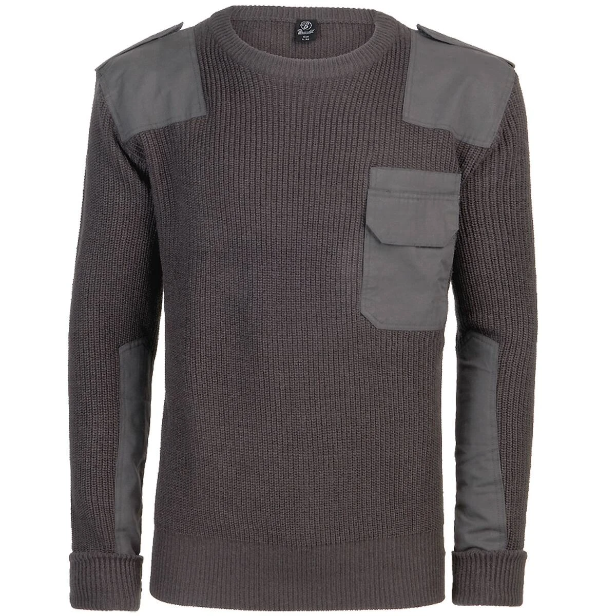 Der bewährte Bundeswehr Pullover aus wärmenden Polyacryl besitzt eine Brusttasche, einen doppelten Strickkragen sowie Schulterklappen mit Klettverschluss und Stiftasche. Die Ellenbogen- und Schulterpartien wurden mittels Segeltuchbesatz verstärkt und sind damit besonders robust. An den Ärmeln und am Abschluss hat der Pullover breite Strickbündchen. Er wird aus rechtlichen Gründen ohne Hoheitsabzeichen ausgeliefert und ist damit auch ideal als Arbeitspullover und in der Freizeit einsetzbar.