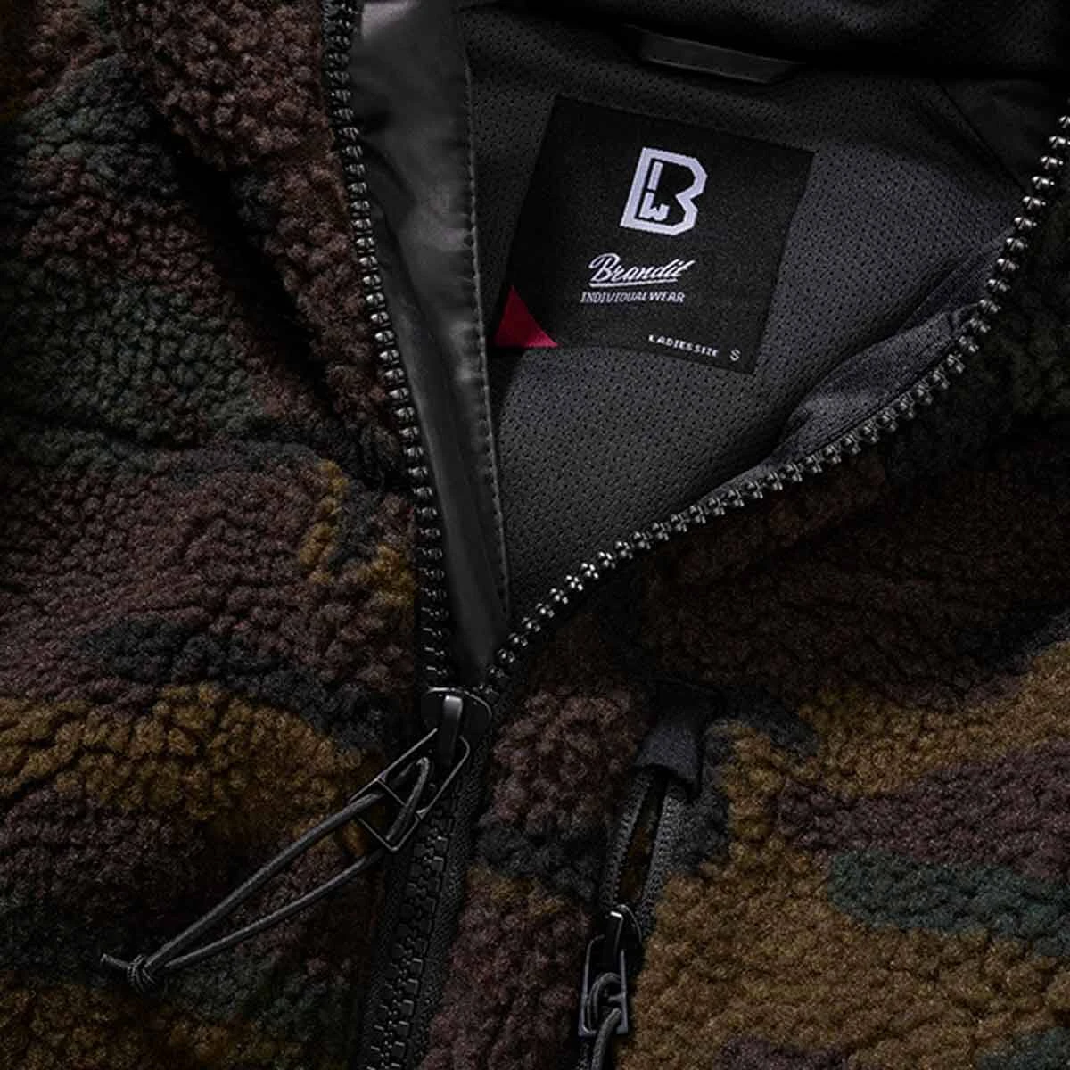 Die Ladies Teedyfleece Jacke von Brandit besitzt eine hohe Wärmeleistung und ist perfekt geeignet für kalte Tage. Das hochflorige, warme Teddy-Fleece außen in Verbindung mit dem atmungsaktiven Innenfutter sorgen für ein angenehmes Tragegefühl. Die geräumige Kapuze wärmt zusätzlich. Der hochwertige Mittelreißverschluss mit Windschutzleiste und der Kinnschutz halten jeden Luftzug ab. Weitere nützliche Details sind die geräumige Brusttasche und 2 seitliche Einschubtaschen je mit Reverse-Reißverschluss. Die Innentasche schließt mittels Klettverschlusses. Alle Zipper besitzen eine praktische Zughilfe. Die elastischen Ärmelabschlüsse und der Hüftbund sorgen für den nötigen Tragekomfort. Die Damen (Women) Winterjacke besitzt einen femininen Schnitt.